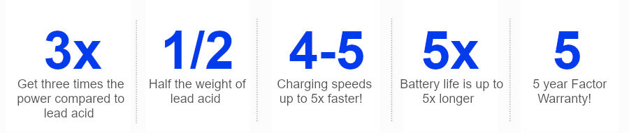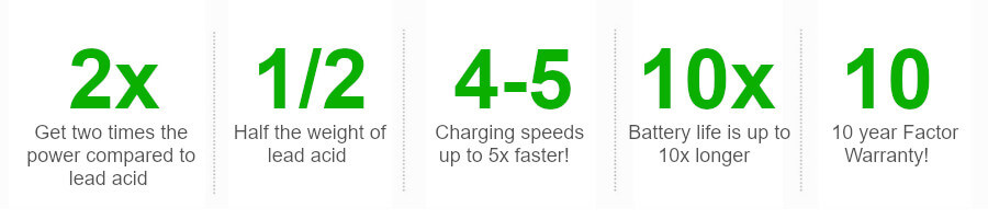 Lithium NMC or (Nickel Manganese Cobalt) batteries are light weight and up to 3x powerful. NMC batteries pack a punch delivering consistent high power to high draw equipment over 1000+ cycles and backed by our 5 year factory warranty.